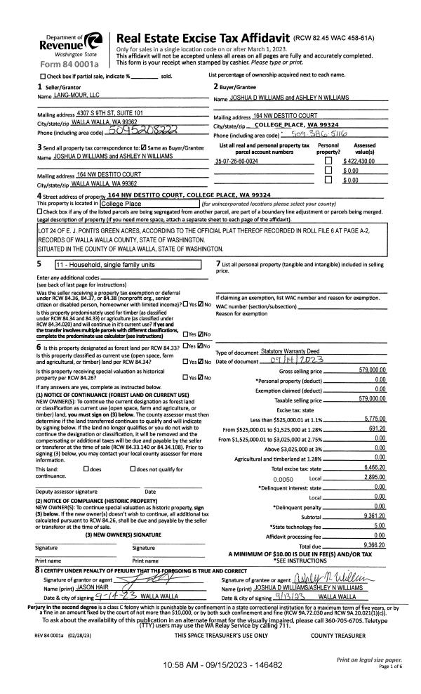 | 1 | 09/15/2023 | SWD | STATUTORY WARRANTY DEED | LANG-MOUR LLC | WILLIAMS JOSHUA D & ASHLEY N | | | $579,000.00 | 146482 | 2023-05393 |