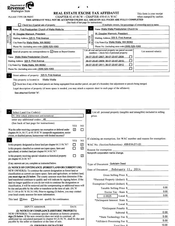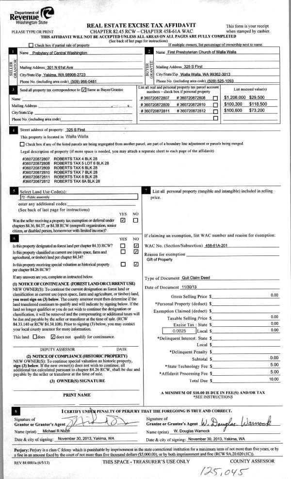 | 1 | 02/12/2014 | QCD | QUIT CLAIM DEED | FIRST PRESBYTERIAN CHURCH OF WALLA WALLA | WALLA WALLA PRESBYTERIAN CHURCH | | 6-PARCELS | | 125429 | 2014-01078 |