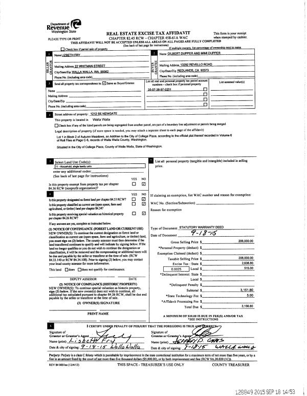 | 1 | 09/18/2015 | SWD | STATUTORY WARRANTY DEED | FRY LISBETH | THE DUPPER FAMILY TRUST | | | $206,000.00 | 128849 | 2015-08200 |