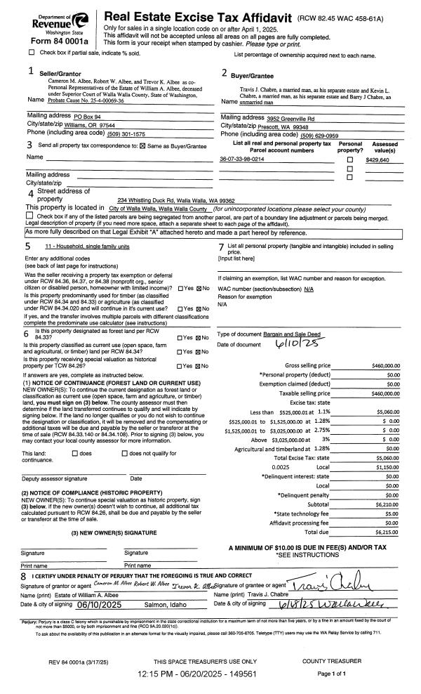 | 2 | 06/20/2025 | BARGAIN & | BARGAIN & SALE DEED | ALBEE WILLIAM A | CHABRE TRAVIS J & | | | $460,000.00 | 149561 | 2025-03490 |