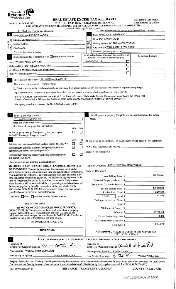| 3 | 08/28/2015 | SWD | STATUTORY WARRANTY DEED | MACKIN WILLIAM & RENEE | WENTLAND RANDALL S & SHAKINA S | | | $179,000.00 | 128712 | 2015-07565 |