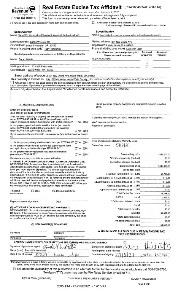| 2 | 05/19/2021 | SWD | STATUTORY WARRANTY DEED | WENTLAND RANDALL S & SHAKINA S | HILDRETH SARA | | | $345,000.00 | 141580 | 2021-06064 |