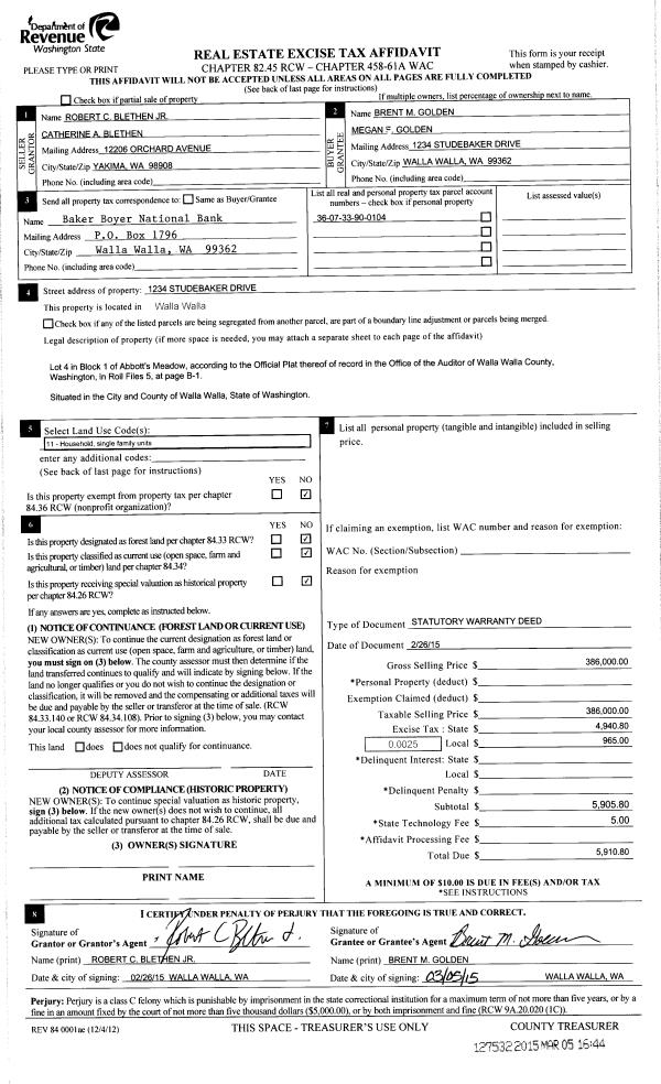 | 1 | 03/05/2015 | SWD | STATUTORY WARRANTY DEED | BLETHEN ROBERT C JR & CATHERINE A | GOLDEN BRENT M & MEGAN F | | | $386,000.00 | 127532 | 2015-01903 |