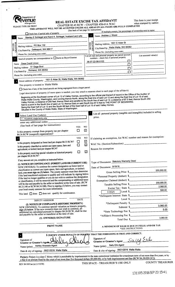| 3 | 09/23/2016 | SWD | STATUTORY WARRANTY DEED | SCHLEGEL STANLEY E & KAROL A | WOOD ANDREW J | | | $200,000.00 | 131105 | 2016-07807 |