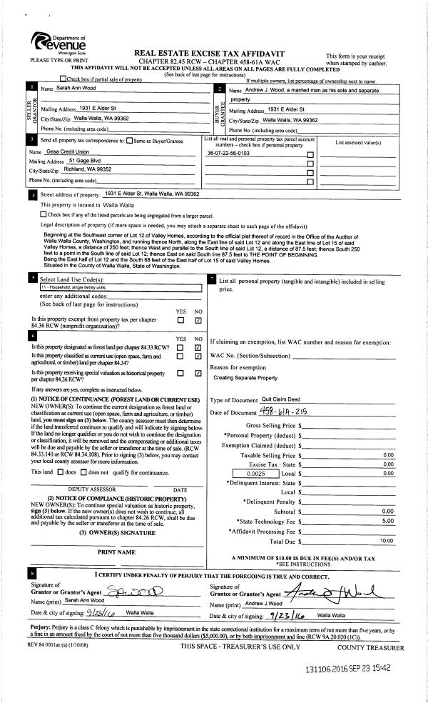 | 2 | 09/23/2016 | QCD | QUIT CLAIM DEED | WOOD SARAH ANN | WOOD ANDREW J | | | | 131106 | 2016-07808 |