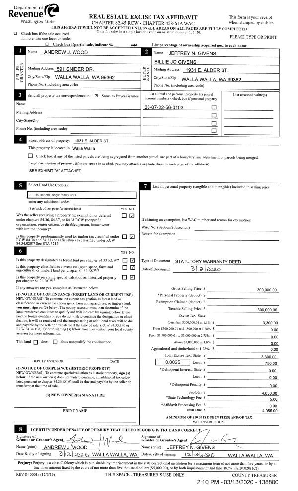 | 1 | 03/13/2020 | SWD | STATUTORY WARRANTY DEED | WOOD ANDREW J | GIVENS JEFFREY N & BILLIE JO | | | $300,000.00 | 138800 | 2020-02340 |