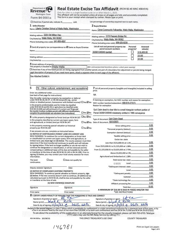 | 3 | 11/13/2023 | QCD | QUIT CLAIM DEED | CHRIST COMMUNITY FELLOWSHIP WALLA WALLA WA | CHRIST COMMUNITY FELLOWSHIP WALLA WALLA WA | | | | 0 | 2023-06635 |
