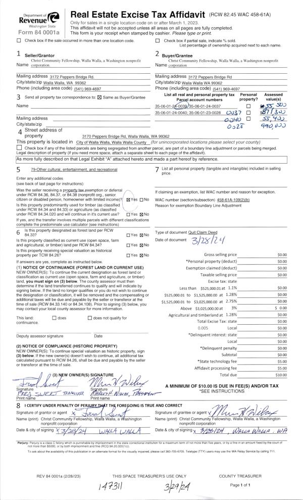 | 1 | 03/29/2024 | QCD | QUIT CLAIM DEED | CHRIST COMMUNITY FELLOWSHIP WALLA WALLA WA | CHRIST COMMUNITY FELLOWSHIP WALLA WALLA WA | | | | 147311 | 2024-01537 |