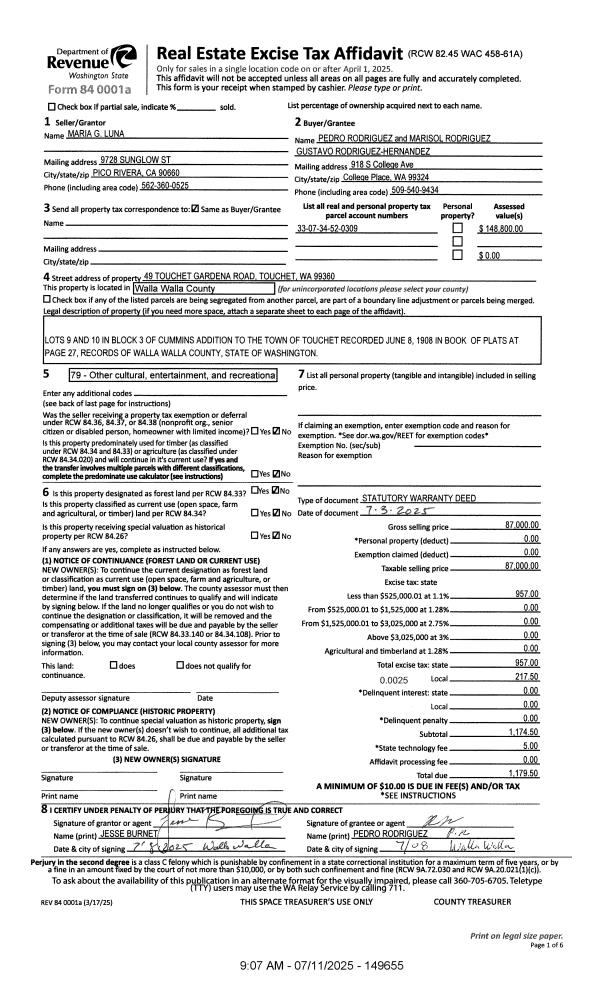 | 1 | 07/11/2025 | SWD | STATUTORY WARRANTY DEED | LUNA G MARIA | RODRIGUEZ PEDRO & MARISOL | | | $87,000.00 | 149655 | 2025-03940 |