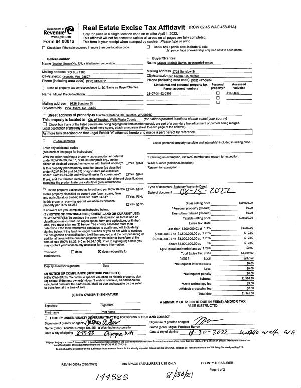 | 4 | 08/30/2022 | SWD | STATUTORY WARRANTY DEED | TOUCHET GRANGE #251 | PRECIADO-BARRON MIGUEL | | | $99,000.00 | 144585 | 2022-07275 |