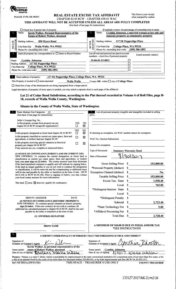 | 2 | 08/31/2017 | SWD | STATUTORY WARRANTY DEED | WALKER ROBERT D ESTATE OF | JOHNSTON CYNTHIA | | | $153,000.00 | 133127 | 2017-06846 |