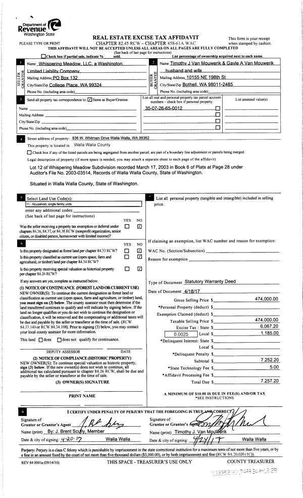| 1 | 04/24/2017 | SWD | STATUTORY WARRANTY DEED | WHISPERING MEADOWS LLC | VAN MOUWERIK TIMOTHY J & GAYLE A | | | $474,000.00 | 132252 | 2017-03054 |