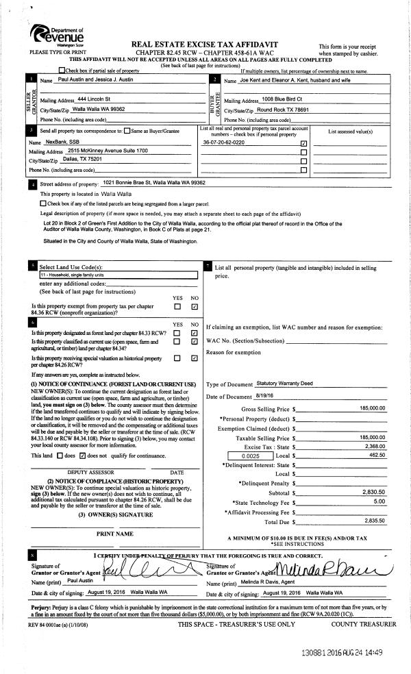 | 4 | 08/24/2016 | SWD | STATUTORY WARRANTY DEED | AUSTIN PAUL & JESSICA J | KENT JOE & ELEANOR A | | | $185,000.00 | 130881 | 2016-06792 |