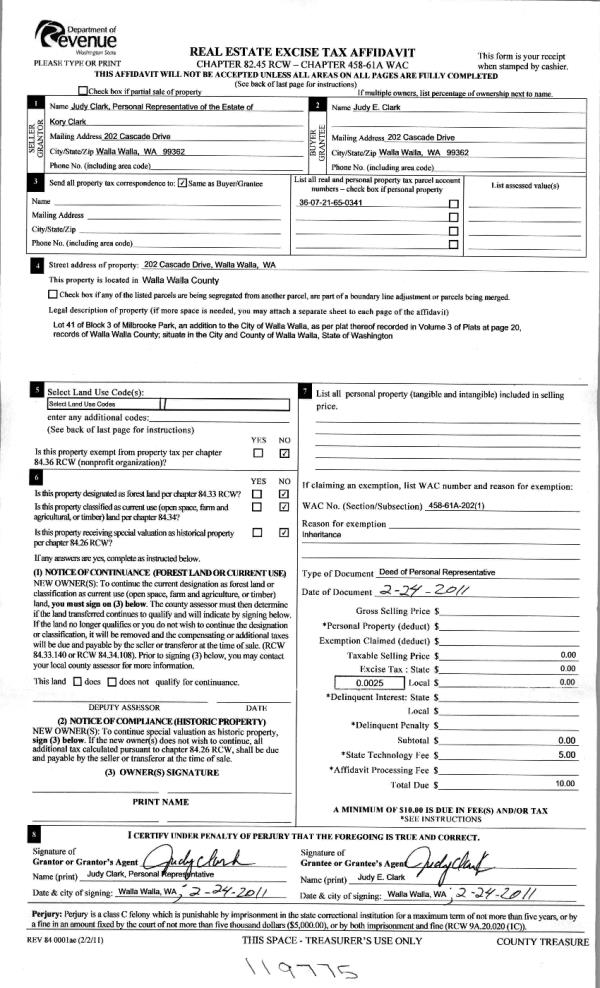 | 4 | 02/24/2011 | WARRANTY D | WARRANTY DEED | CLARK, KORY ESTATE OF | CLARK, JUDY E | | | | 119775 | 2011-01727 |