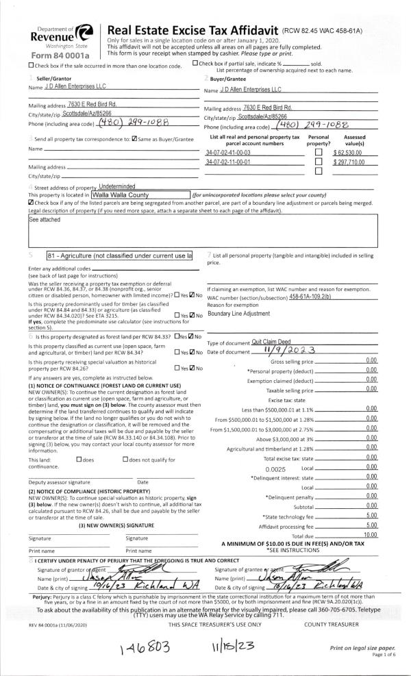 | 4 | 11/15/2023 | QCD | QUIT CLAIM DEED | J D ALLEN ENTERPRISES LLC | MOREL FARMS INC | | | | 146801 | 2023-06705 |