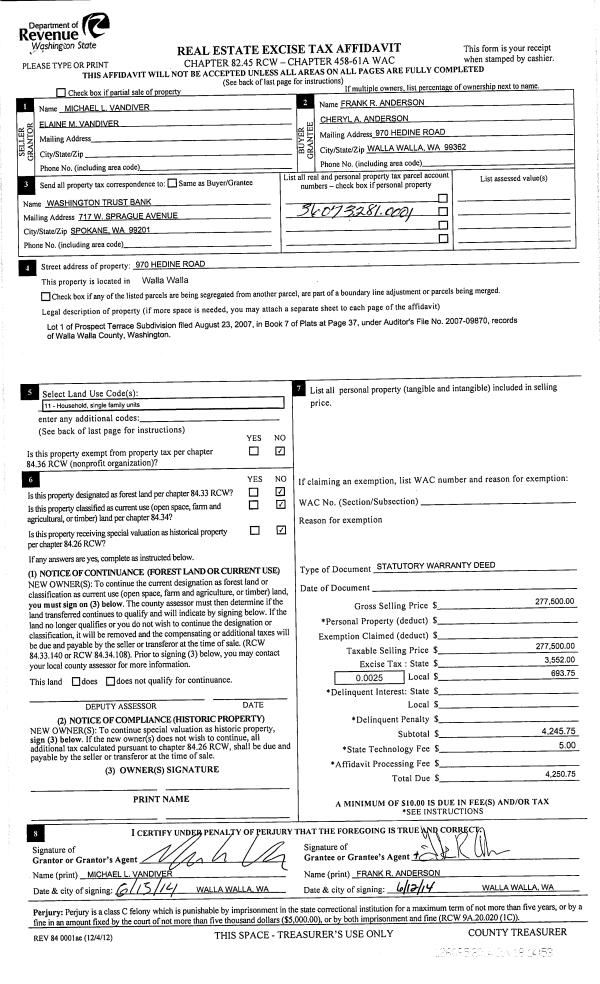| 3 | 06/18/2014 | SWD | STATUTORY WARRANTY DEED | VANDIVER MICHAEL L & ELAINE M | ANDERSON FRANK R & CHERYL A | | | $277,500.00 | 126095 | 2014-04197 |
