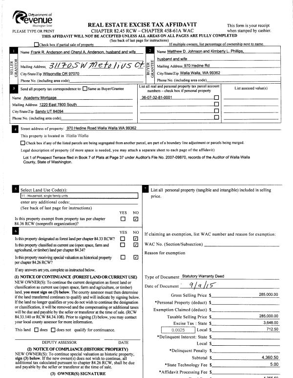 | 2 | 09/11/2015 | SWD | STATUTORY WARRANTY DEED | ANDERSON FRANK R & CHERYL A | JOHNSON MATTHEW D | | | $285,000.00 | 128804 | 2015-07965 |