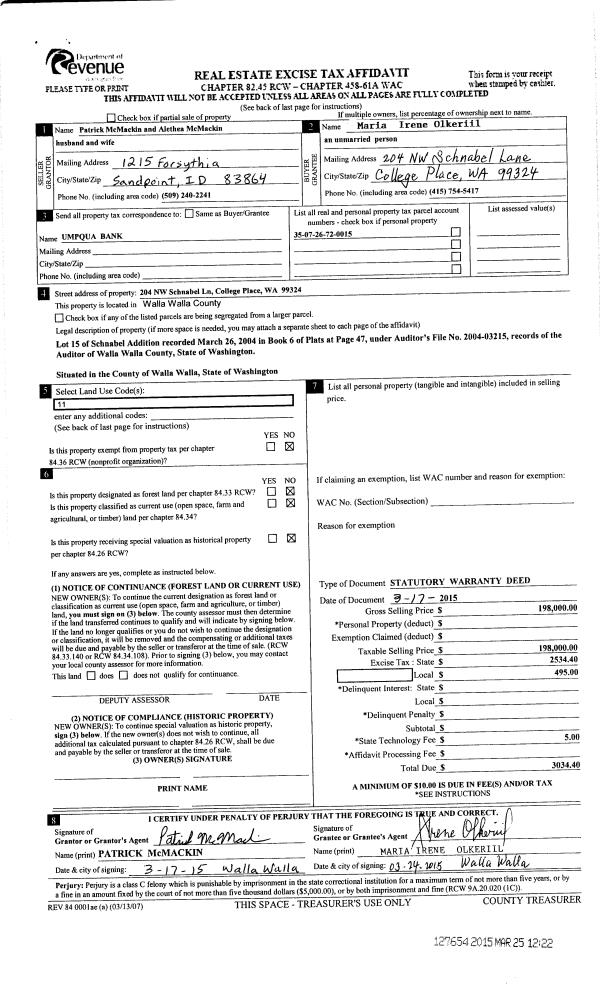 | 1 | 03/25/2015 | SWD | STATUTORY WARRANTY DEED | MC MACKIN PATRICK & ALETHEA | OLKERIIL MARIA IRENE | | | $198,000.00 | 127654 | 2015-02438 |