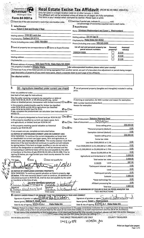 | Mailing Address: | SUSAN L WESTMORELAND 231 W OAK ST WALLA WALLA, WA 99362 | % Ownership: | 100.0000000000% |