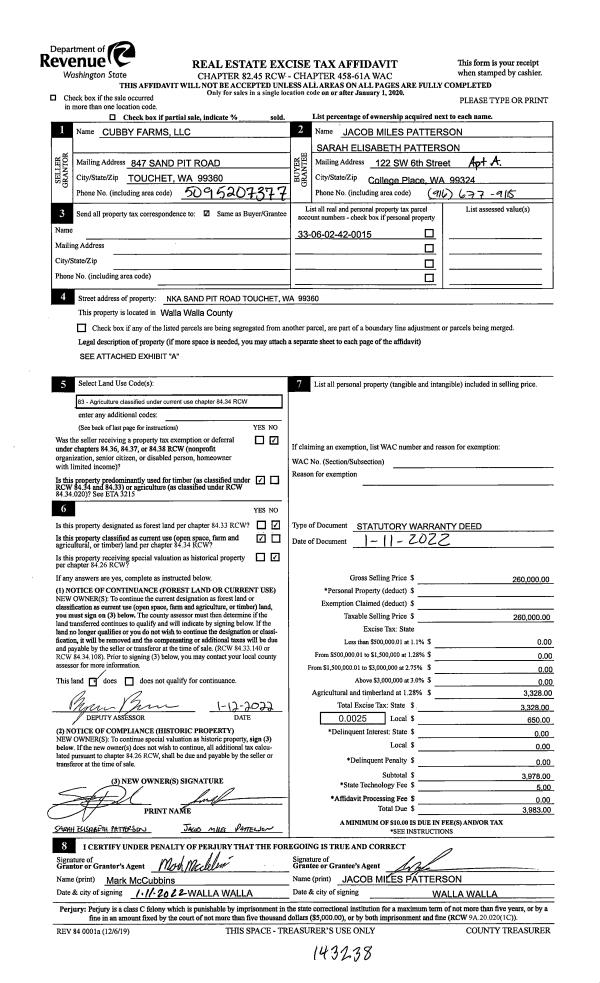 | 1 | 01/12/2022 | SWD | STATUTORY WARRANTY DEED | CUBBY FARMS LLC | PATTERSON JACOB MILES & SARAH ELISABETH | | | $260,000.00 | 143238 | 2022-00397 |