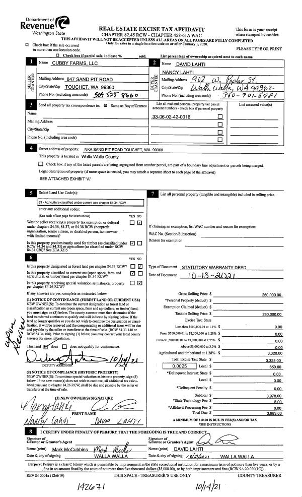 | 2 | 10/14/2021 | SWD | STATUTORY WARRANTY DEED | CUBBY FARMS LLC | LAHTI DAVID & NANCY | | | $260,000.00 | 142671 | 2021-12512 |