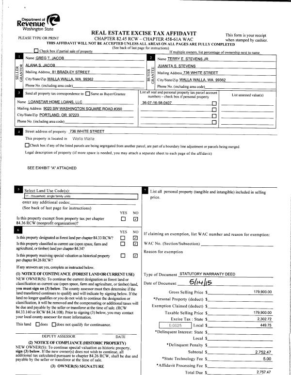 | 2 | 05/18/2015 | SWD | STATUTORY WARRANTY DEED | JACOB GREG T & ALANNA S | STEVENS TERRY E JR & JUANITA S | | | $179,900.00 | 128003 | 2015-04223 |