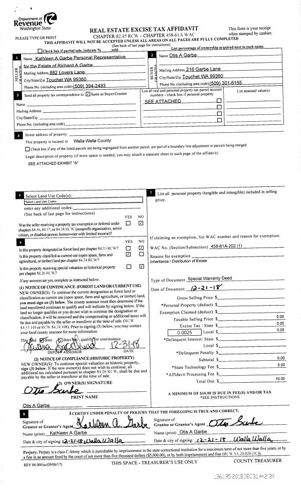 | Mailing Address: | OTIS A GARBE PO BOX 196 TOUCHET, WA 99360 | % Ownership: | 100.0000000000% |