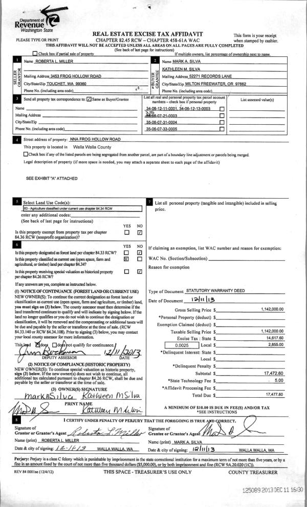 | 1 | 12/11/2013 | WARRANTY D | WARRANTY DEED | MILLER ROBERTA L | SILVA MARK A & KATHLEEN M | | 5-PARCELS | $1,142,000.00 | 125089 | 2013-11878 |