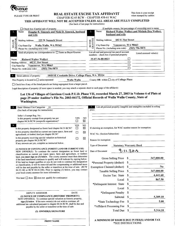 | 3 | 09/17/2015 | SWD | STATUTORY WARRANTY DEED | SIMCOCK DOUGLAS R & NICKI D | WOLLERT RICHARD WALTER & MICHELE DRU | | | $347,000.00 | 128836 | 2015-08134 |