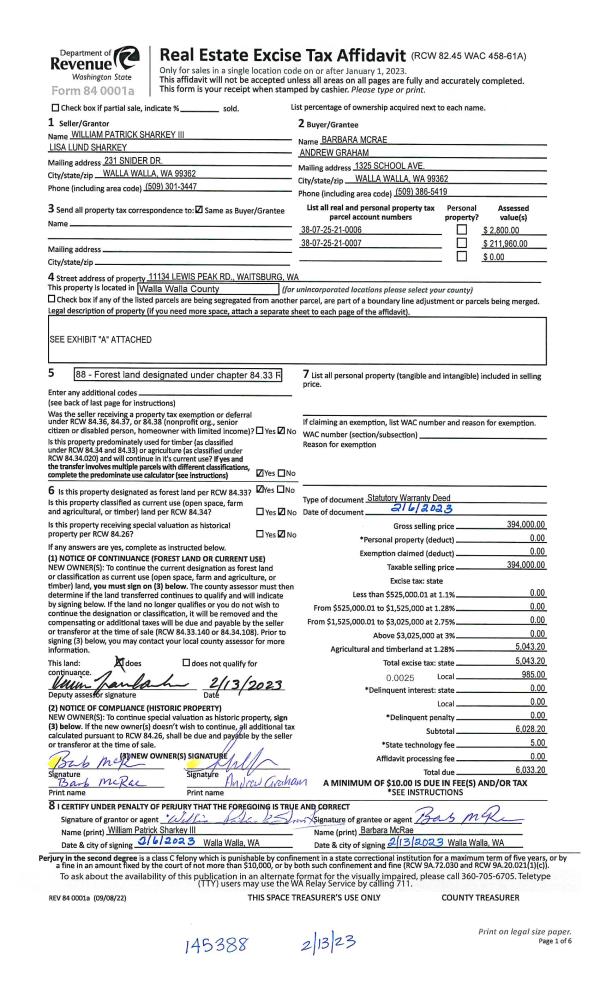 | 1 | 02/13/2023 | SWD | STATUTORY WARRANTY DEED | SHARKEY WILLIAM III & LISA | MCRAE BARBARA & ANDREW GRAHAM | | 2-PARCELS | $394,000.00 | 145388 | 2023-00716 |