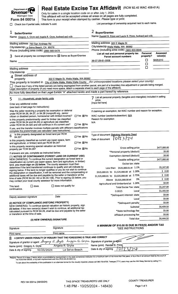| 1 | 10/25/2024 | SWD | STATUTORY WARRANTY DEED | GRYTE GREGORY A & ANGELA R | PRINTZ RANDALL B & LAURIE E | | | $477,000.00 | 148430 | 2024-06233 |