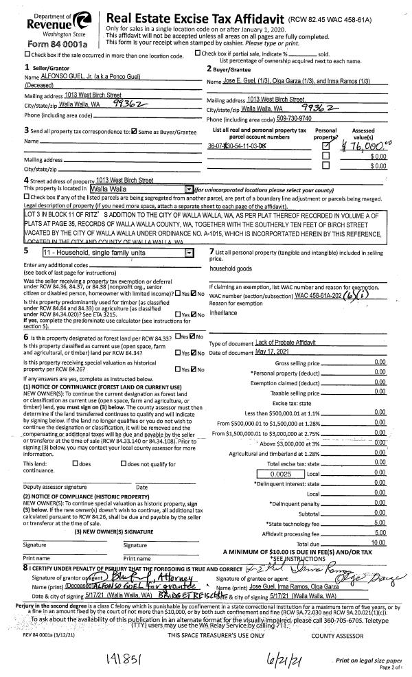 | 2 | 05/17/2021 | LOPA | LACK OF PROBATE AFFIDAVIT | GUEL ALFONSO JR | GUEL JOSE E ET AL | | | $0.00 | 141851 | 2021-07532 |