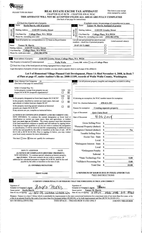| 2 | 04/28/2014 | QCD | QUIT CLAIM DEED | | HARRIS TANNER M | | | | 125777 | 2014-02846 |