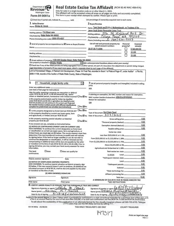 | 1 | 03/29/2024 | QCD | QUIT CLAIM DEED | SMICK SHIRLEY M | SMICK JASON SCOTT REVOCABLE LIVING TRUST | | | | 147317 | 2024-01548 |