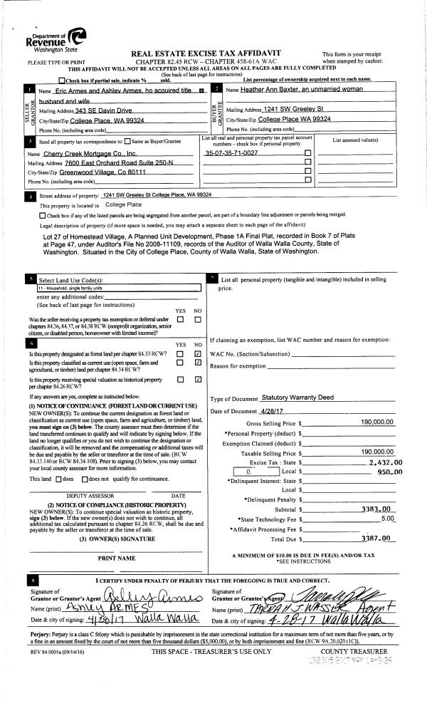 | 2 | 05/01/2017 | SWD | STATUTORY WARRANTY DEED | ARMES ERIC | BAXTER HEATHER ANN | | | $190,000.00 | 132305 | 2017-03270 |