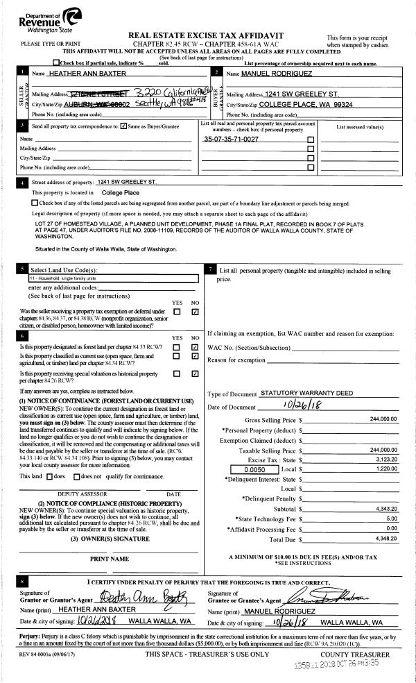 | 1 | 10/26/2018 | SWD | STATUTORY WARRANTY DEED | BAXTER HEATHER ANN | RODRIGUEZ MANUEL | | | $244,000.00 | 135811 | 2018-08876 |
