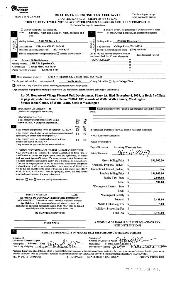 | 1 | 06/28/2019 | SWD | STATUTORY WARRANTY DEED | NASH EDWARD J & LINDA M | GOLKE-BAHNSEN MORNA | | | $196,000.00 | 137191 | 2019-04660 |