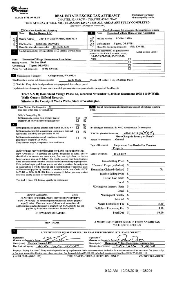 | 2 | 11/11/2019 | BARGAIN & | BARGAIN & SALE DEED | HAYDEN HOMES LLC | HOMESTEAD VILLAGE HOMEOWNERS ASSOCIATION | | | $0.00 | 138124 | 2019-09622 |