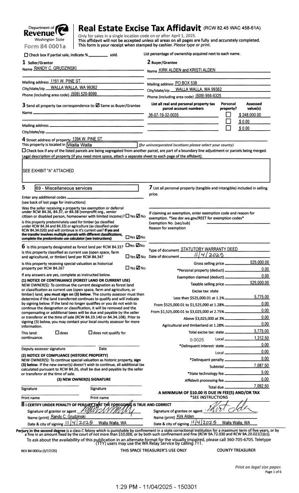 | 1 | 11/04/2025 | SWD | STATUTORY WARRANTY DEED | GRUDZINSKI RANDALL C | ALDEN KIRK & KRISTI | | | $525,000.00 | 150301 | 2025-06837 |