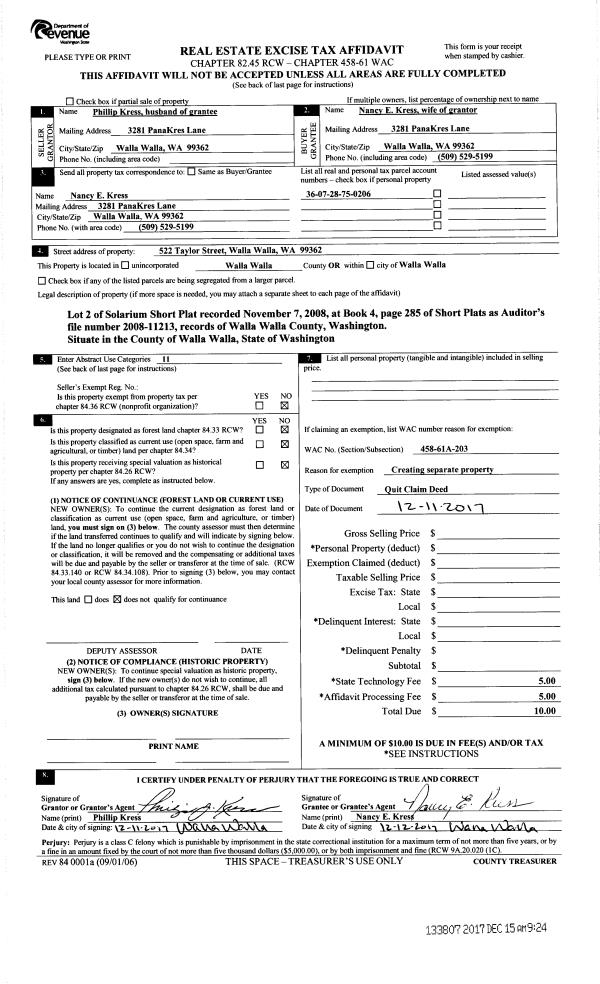| 1 | 12/15/2017 | QCD | QUIT CLAIM DEED | KRESS PHILLIP | KRESS NANCY E | | | | 133807 | 2017-10091 |