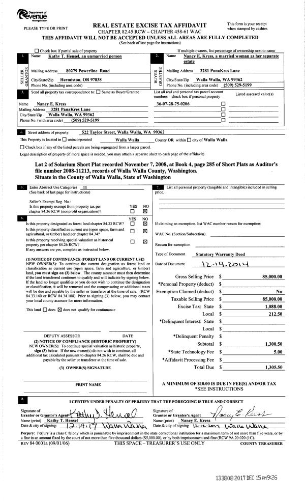 | 2 | 12/15/2017 | SWD | STATUTORY WARRANTY DEED | HENSEL KATHY T | KRESS NANCY E | | | $85,000.00 | 133808 | 2017-10092 |