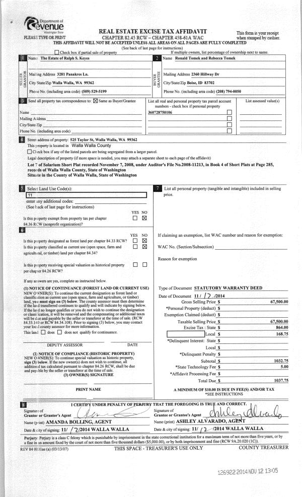| 3 | 11/12/2014 | SWD | STATUTORY WARRANTY DEED | KEYES RALPH S ESTATE OF | TOMEK RONALD & REBECCA | | | $67,500.00 | 126922 | 2014-08215 |