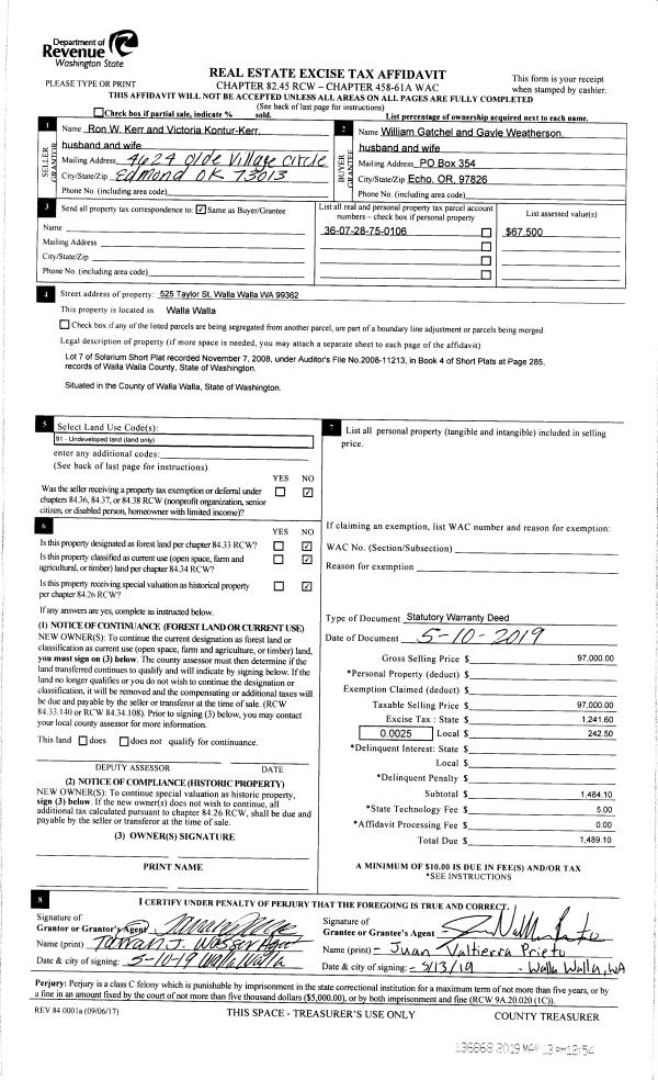 | 1 | 05/13/2019 | SWD | STATUTORY WARRANTY DEED | KERR RON W | GATCHEL WILLIAM & GAYLE WEATHERSON | | | $97,000.00 | 136868 | 2019-03173 |
