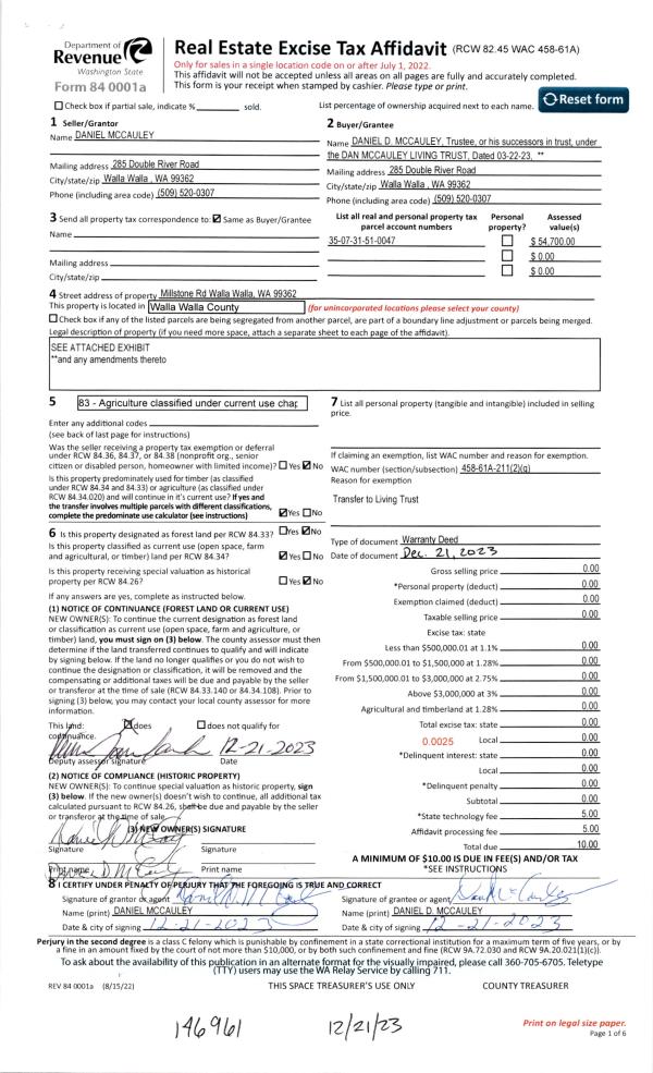 | 1 | 12/21/2023 | WARRANTY D | WARRANTY DEED | MC CAULEY DANIEL & CATHERINE | MCCAULEY DAN LIVING TRUST | | | | 146961 | 2023-07403 |