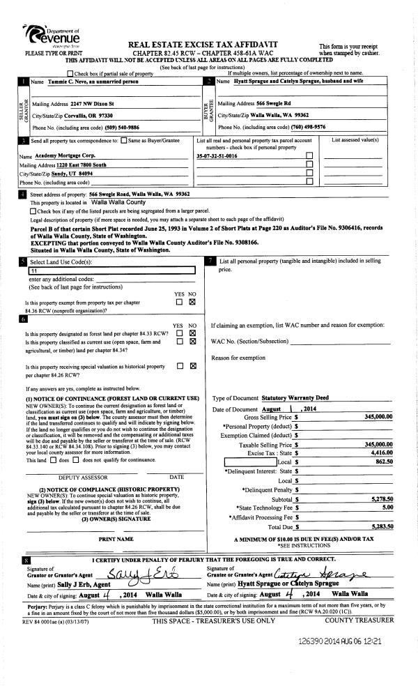 | 3 | 04/03/2013 | WARRANTY D | WARRANTY DEED | NEVE WILLIAM L & TAMMIE C | NEVE TAMMIE C | | | | 0 | CC #12-3-00094-2 |