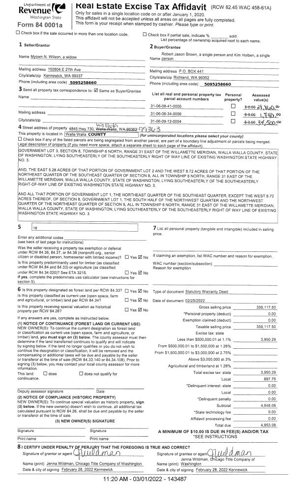 | 1 | 02/25/2022 | SWD | STATUTORY WARRANTY DEED | WILSON MYOWN N | BROWN ROBERT JASON | | 3-PARCELS | $359,118.00 | 143487 | 2022-01798 |