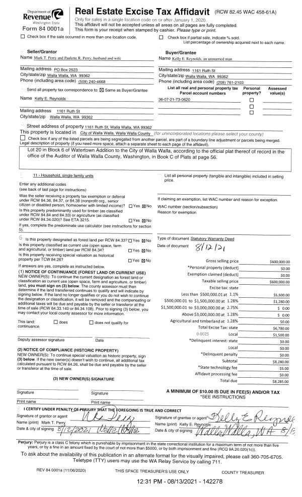 | 1 | 08/13/2021 | SWD | STATUTORY WARRANTY DEED | PERRY MARK T & PAULETTE R | REYNOLDS KELLY E | | | $600,000.00 | 142278 | 2021-09901 |