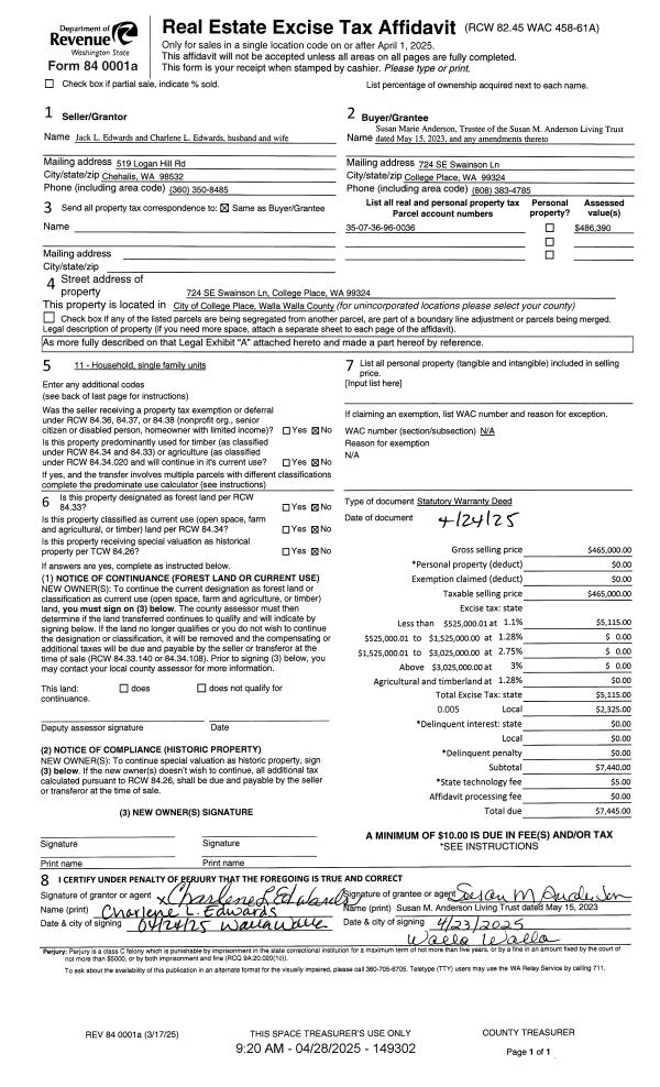 | 1 | 04/28/2025 | SWD | STATUTORY WARRANTY DEED | EDWARDS JACK L & CHARLENE L | SUSAN M ANDERSON LIVING TRUST | | | $465,000.00 | 149302 | 2025-02250 |