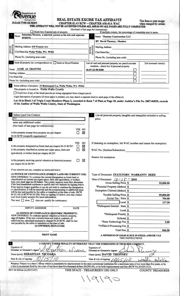 | 2 | 10/15/2010 | WARRANTY D | WARRANTY DEED | NICOARA, SEBASTIAN & SHELAH | THONNEY CONSTRUCTION LLC | | | $55,000.00 | 119190 | 2010-08311 |