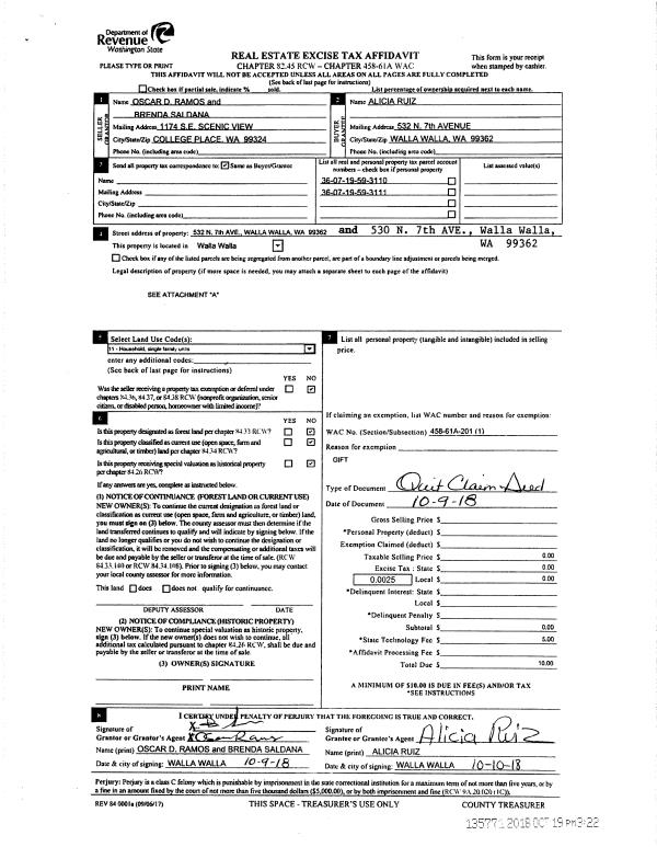 | 2 | 10/19/2018 | QCD | QUIT CLAIM DEED | RAMOS OSCAR D | RUIZ ALICIA | 2 PARCELS | | $0.00 | 135771 | 2018-08682 |